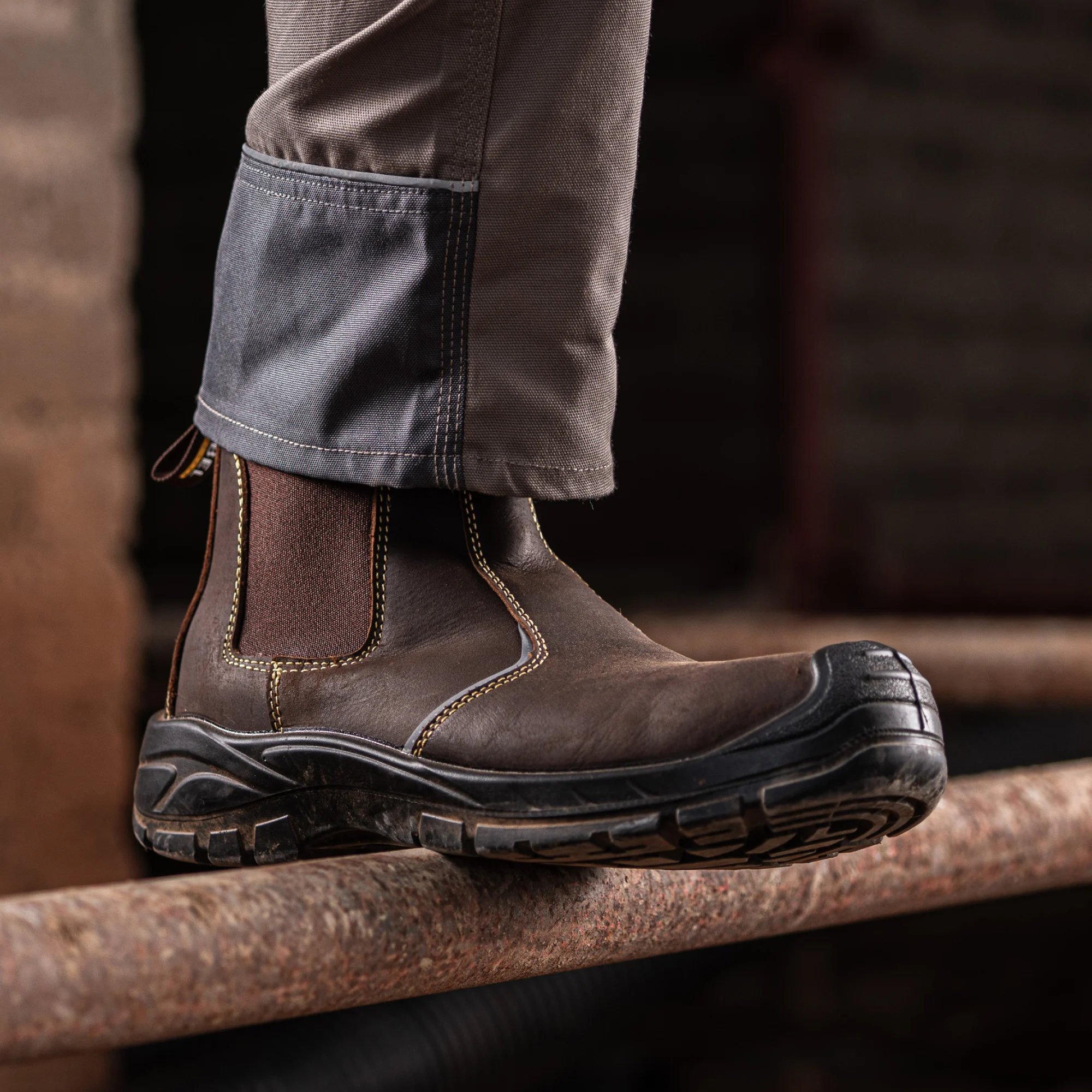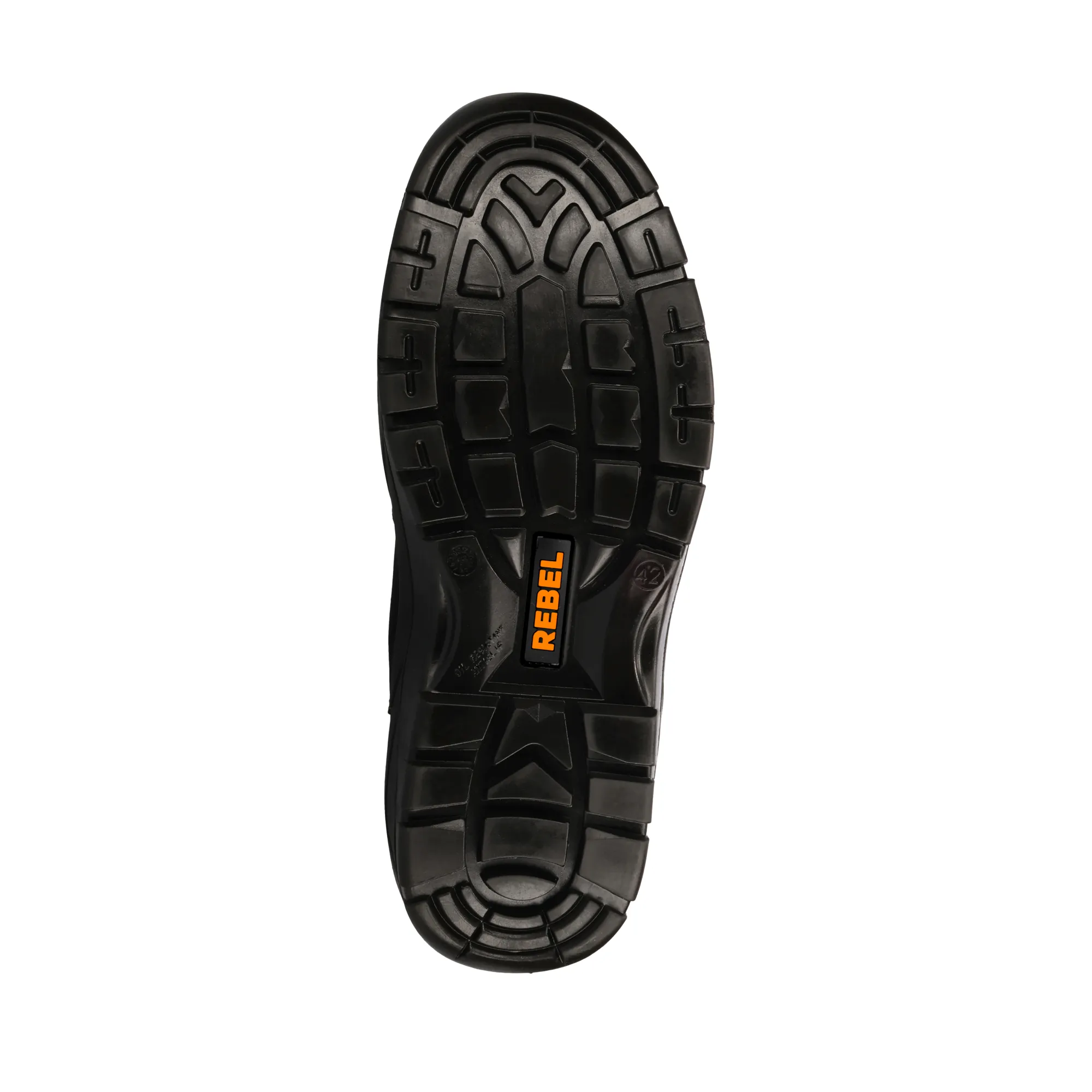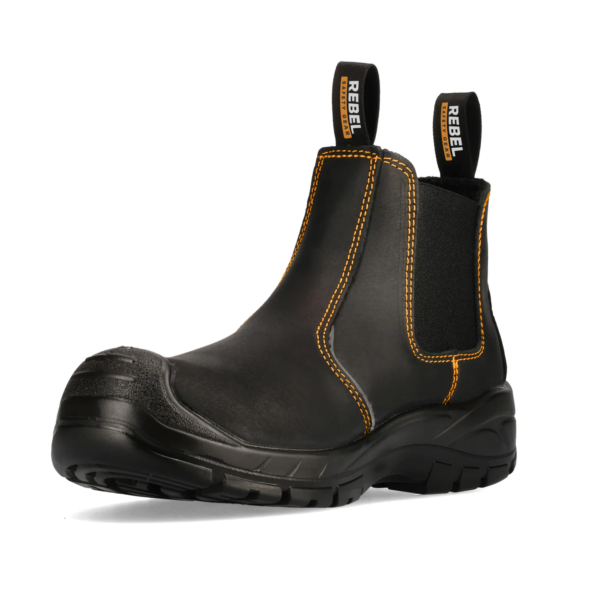 The REBEL Anvil Chelsea Boot is a hard-wearing chelsea boot designed for general applications. It features a high-quality full-grain leather upper with an anti-scuff toe guard and a reflective strip for added visibility. The boot is equipped with a 200J steel toe cap for impact protection. The dual-density polyurethane (PU) sole provides excellent slip resistance and heat resistance up to 90°C on contact. It is available in black and brown colour and comes in sizes ranging from 3 to 13 (UK). They are ISO 20345 and NRCS approved.